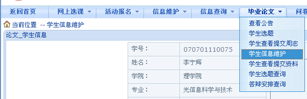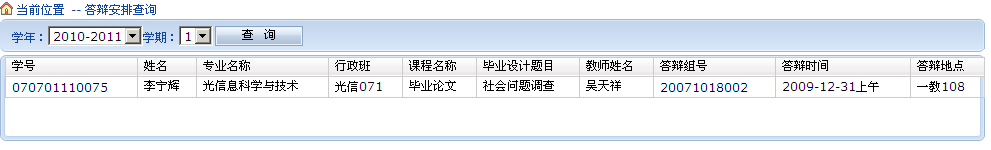 学生通过该功能查看自已的毕业答辩安排情况,菜单如下: