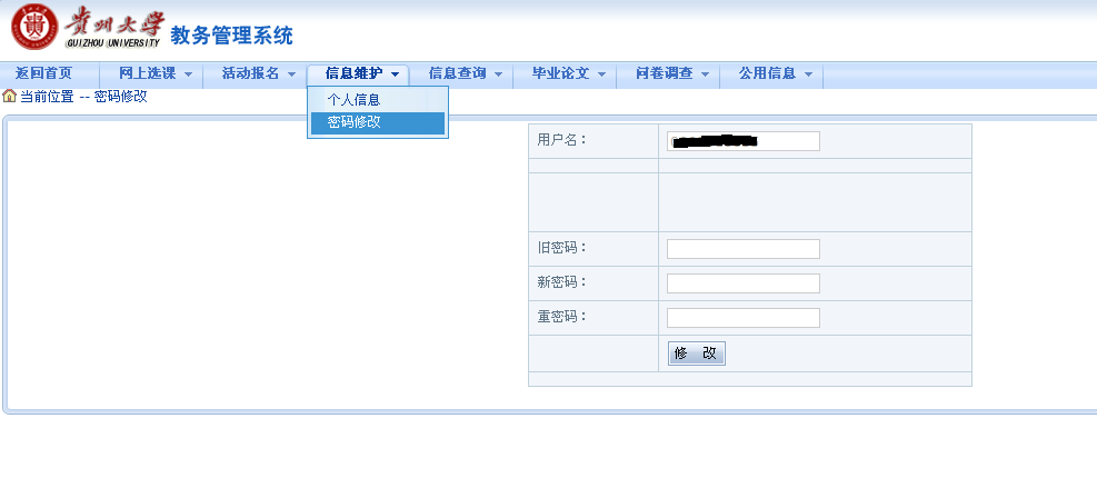 登陆系统以后,先把自己的密码修改,在信息维护——密码修改