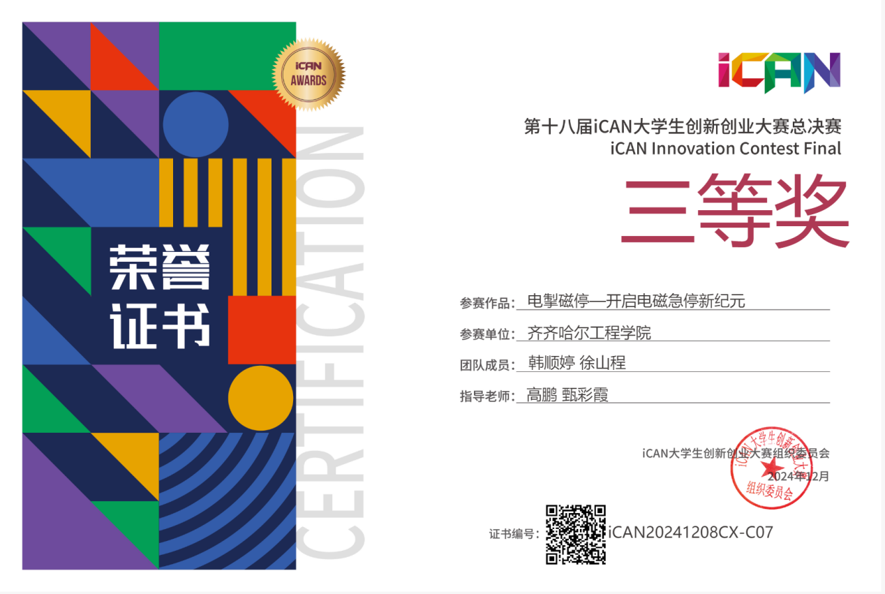 近日,iCAN大学生创新创业大赛组委会传来喜讯,beat365机电工程系电气工程及其自动化专业韩顺婷、徐山程团队的“电掣磁停—开启电磁急停新纪元”项目,荣获全国总决赛三等奖。 12月8日,第十八届iCAN大学生创新创业大赛全国总决赛在山东农业工程学院(淄博校区)成功落下帷幕。本届大赛设创新、创业与挑战赛三个赛道,共吸引了32144个团队参加,覆盖高校1500余所,分赛区选拔后,800个优秀项目参加全国决赛。beat365电气工程及其自动...