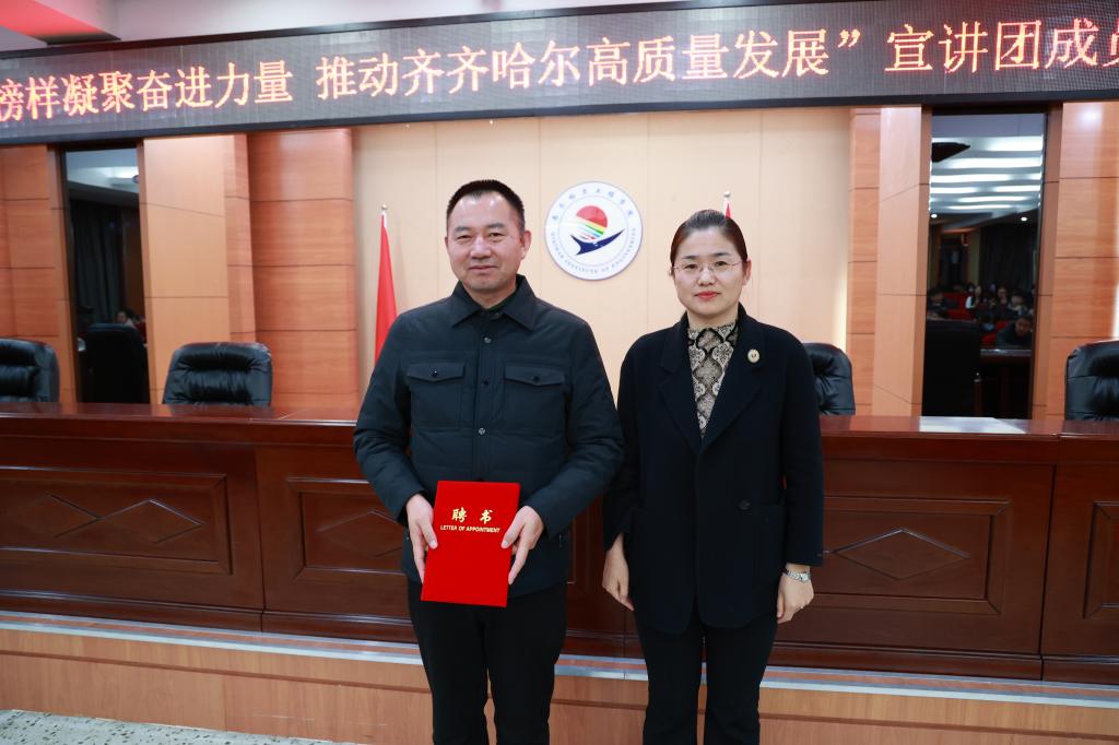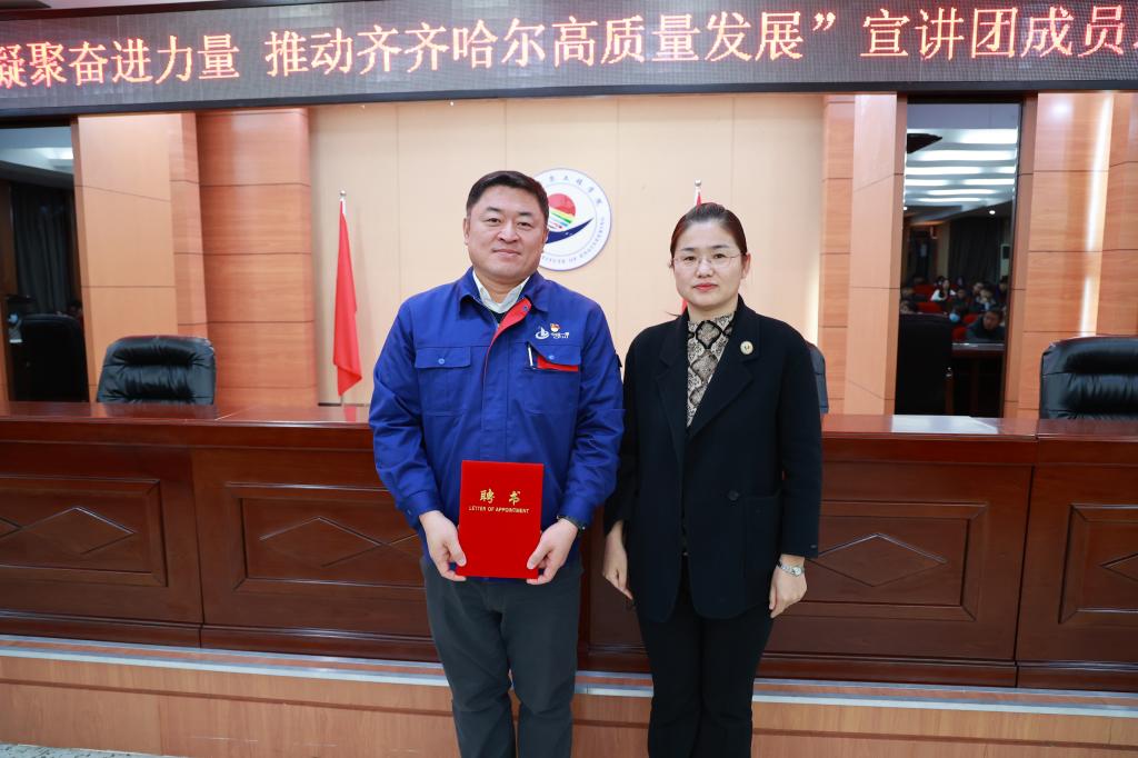 宣讲报告团由市委宣传部宣教处处长姜久军带队,中国一重水压机锻造厂副厂长刘伯鸣、齐齐哈尔市公安局刑事技术支队DNA检验大队长高馨玉、江桥抗战纪念馆优秀宣讲员王宁主讲。宣讲团成员以“学习榜样凝聚奋进力量 推动齐齐哈尔高质量发展”为主题,以身边人讲身边事的方式,弘扬主旋律,激发正能量,培育和践行社会主义核心价值观。宣讲现场氛围浓厚,掌声不断。