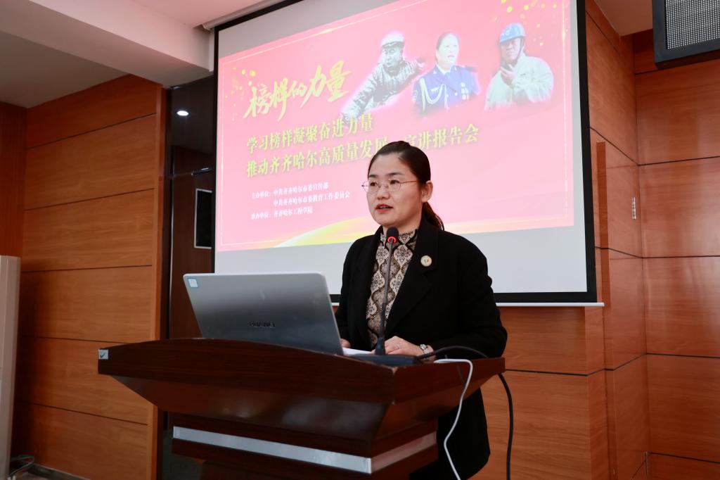 为深入学习贯彻落实党的二十大精神,大力弘扬中国共产党人精神谱系,11月7日,由市委宣传部联合市委教育工委共同开展的“学习榜样凝聚奋进力量 推动齐齐哈尔高质量发展”宣讲报告团来校开展宣讲活动。宣讲会由副院长白雪主持,报告会分为现场和线上两个会场,师生代表近200人现场聆听榜样故事,汲取前行力量。