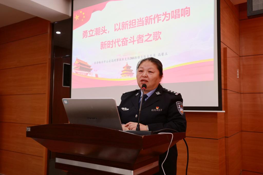 高馨玉作《勇立潮头,以新担当新作为唱响新时代奋斗者之歌》报告,讲述高馨玉同志爱岗敬业、敢为人先,不断在刑技领域求突破,急难险重的任务总是冲在前,加班加点,完成一次又一次艰巨任务,以实际行动和铮铮誓言带出了一支能打硬仗的优秀团队先进事迹。