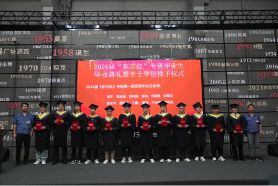 敖林喆宣读《关于表彰东方红一期专班“优秀毕业生”的决定》,12名学生被授予东方红一期专班“优秀毕业生”。大拖公司人力资源部部长苏海龙、中小拖公司企划部部长尚光旭为优秀毕业生颁发荣誉证书。