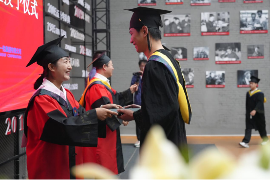 26名毕业生在《加冕进行曲》中依次走上台,院长曹然彬、常务副院长陈景鑫、大拖公司副总经理满孝勇、中小拖公司党委书记、副总经理王彦为毕业生代表正衣冠、扶正流苏、颁发学士学位证书。
