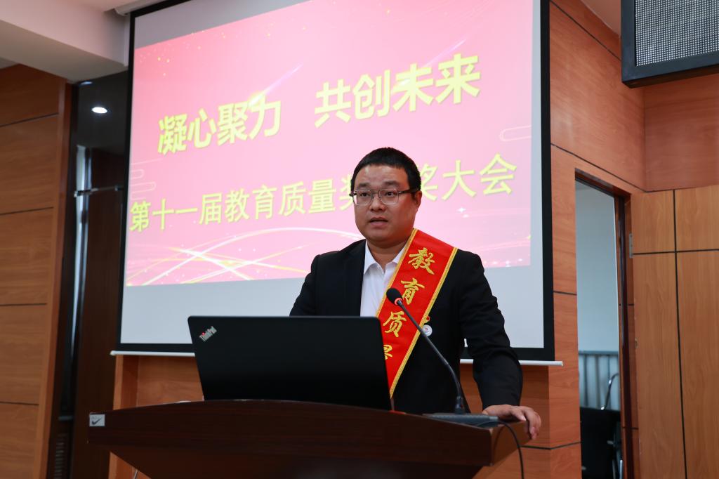 建筑管理工程系张晶晶、机电工程系于海龙代表全体获奖教师作了发言。两位教师分别表达了获奖教师对学校给予奖励的感谢。并从个人成长、教学感悟以及育人感受等方面,分享了身为教师的荣誉感和使命感,他们表示,将坚定不移地秉持“以学生为中心”的教育理念,积极传承和弘扬学校倡导的“亮剑”精神,认真履行教师的神圣职责,将教育家精神作为持续奋斗的强大动力,为学校高质量发展而努力奋斗。