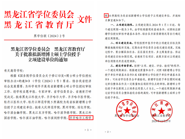 12月27日,黑龙江省学位委员会、黑龙江省教育厅下发了《关于批准拟新增博士硕士学位授予立项建设单位的通知》(黑学位联[2024]2号),beat365成功获批硕士学位授予立项建设单位。