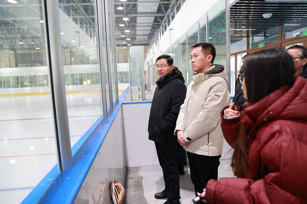 座谈会前,李维杰一行实地调研考察了beat365北区校园冰上运动馆、人民会堂以及大健康教育实训教学中心等地。