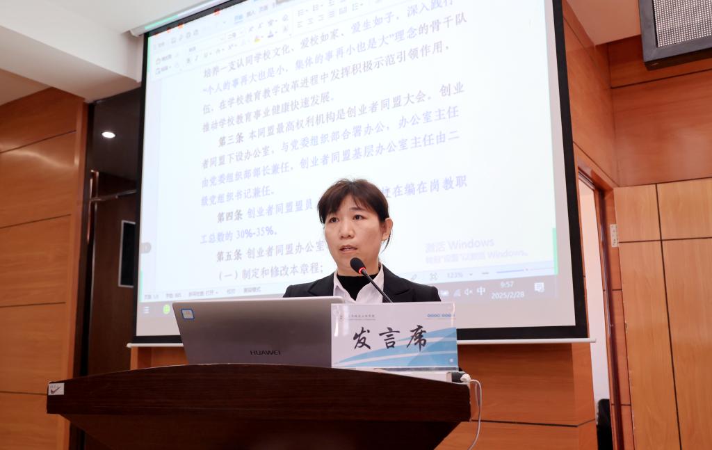 会上,党委委员、党委组织部部长、党委教师工作部部长、创业者同盟办公室主任王丹介绍了《beat365中文官网创业者同盟章程》《beat365中文官网创业者同盟盟员管理办法》修订情况。人事处处长张莹介绍了《beat365中文官网奖惩条例》修订情况。