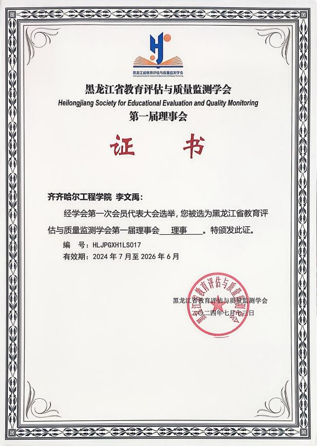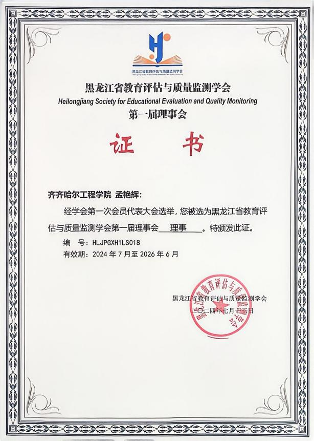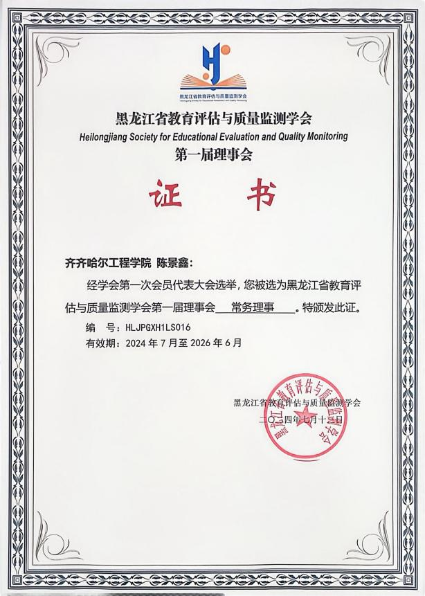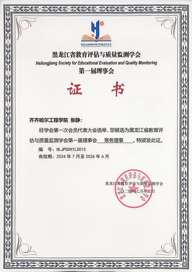 近日,黑龙江省教育评估与质量监测学会第一届理事会成员名单正式公布,beat365党委副书记、副院长陈景鑫和副院长张静当选为常务理事,全面质量管理办公室主任孟艳辉、教务处处长李文禹当选为理事,聘期自2024年7月至2026年6月。