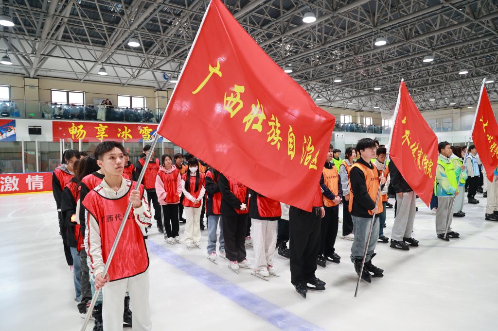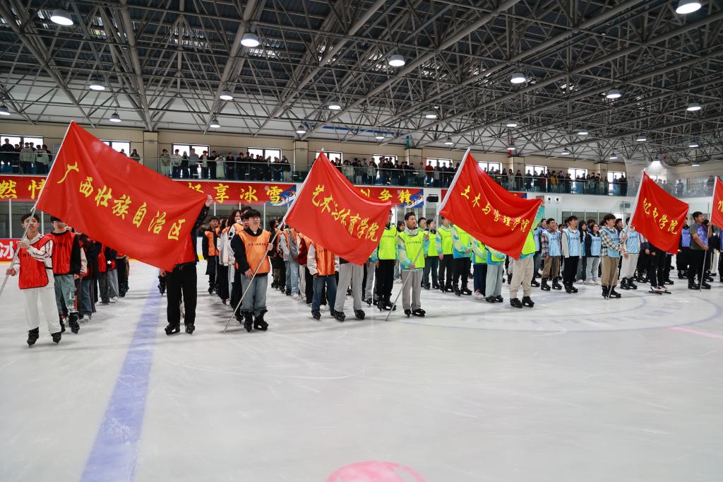 当各院广西学子组成的代表队亮相冰场时,瞬间成为全场焦点,这支由岭南学子组成的队伍,虽来自终年无雪的南方,却英姿飒爽,展现出不输北国健儿的气势,他们将以昂扬的斗志和饱满的热情,在冰场上尽情驰骋,展示了属于他们的青春风采。