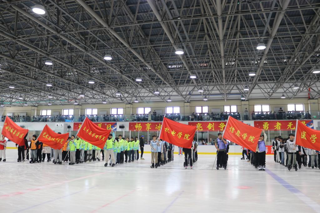 伴随着激昂的《运动员进行曲》,机电学院、土木与管理学院、信息学院、艺术与体育学院、医学院、广西壮族自治区学生代表队脚踩冰鞋,一路纵队滑行进入冰场,他们眼神坚定、身姿矫健,展现出饱满的精神面貌。