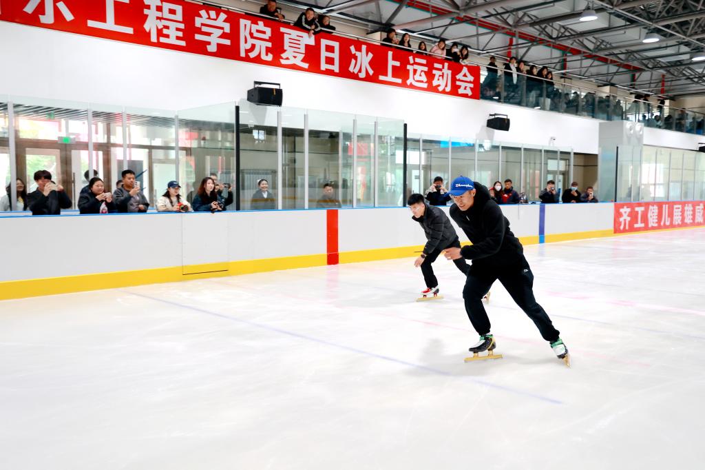 比赛现场,工作人员认真负责,保障赛事顺利进行。各院参赛队伍相互学习交流,提升运动水平,增进友谊,加强团结协作精神。观众席上,此起彼伏的加油声与冰刀划过冰面的清脆声响交织在一起,奏响了夏日里最动感的冰雪交响曲。