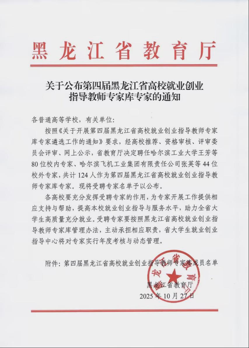 10月27日,黑龙江省教育厅传来喜讯,在《关于公布第四届黑龙江省高校就业创业指导教师专家库专家的通知》中,beat365监事会主席张振笋、学生发展中心主任康静凭借深厚的专业素养和丰富的实践经验,成功入选,荣聘为第四届黑龙江省高校就业创业指导教师专家库专家。