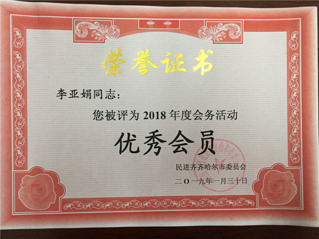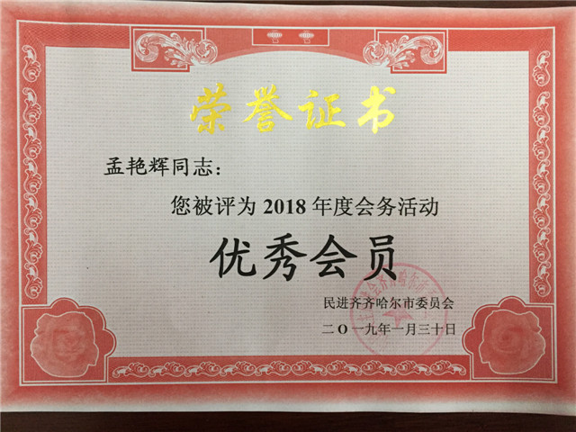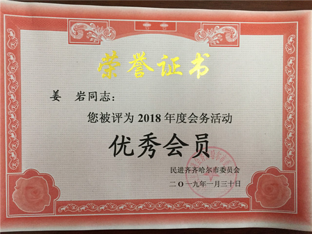 1月31日下午,在民进齐齐哈尔市委2018年度总结表彰大会上,民进beat365中文官网支部被授予“先进集体”荣誉称号,姜岩、李亚娟、孟艳辉被授予“优秀会员”荣誉称号。