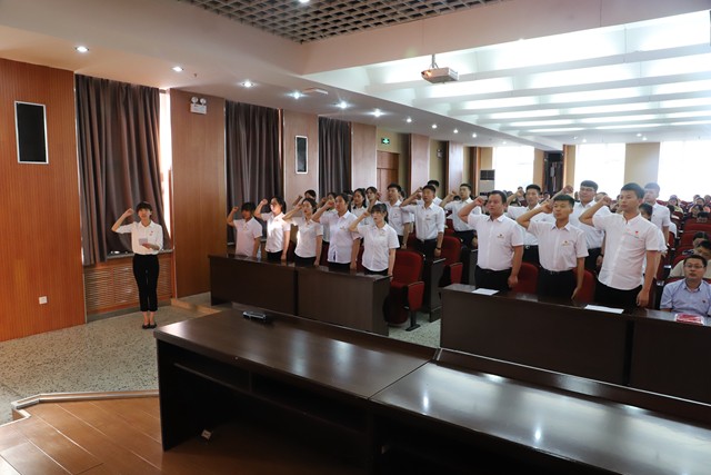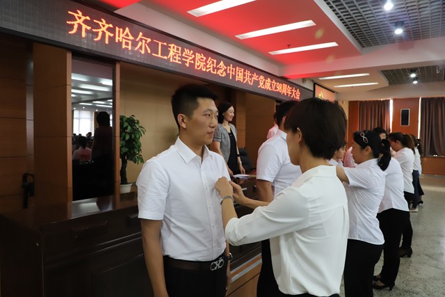 会上举行了老党员为新党员佩戴党徽和新党员入党宣誓仪式。24名新党员分组走到主席台前,庄重地接受老党员代表党组织为他们佩戴党徽,并在领誓人的带领下,面对鲜红的党旗郑重地宣誓,表达自己对中国共产党的忠诚与承诺。