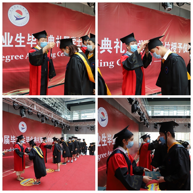 家在本市区的60多位获得学士学位的毕业生代表,依次走到主席台前,由院长曹然彬、校党委书记李敏义为他们拨正流苏,副院长蒋春艳为他们颁发毕业证书和学位证书。