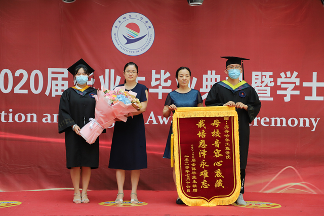 2020届毕业生代表向学校赠送锦旗和鲜花,工会主席、总会计师姜岩与副院长白雪代表学校与毕业生代表合影。