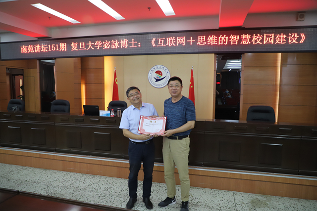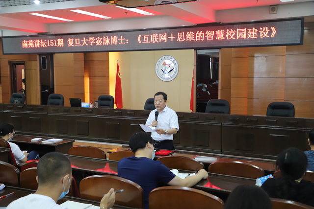 8月11日上午,学校第151期南苑讲坛在图书馆601报告厅举行,复旦大学继续教育学院院长宓詠博士作《互联网+思维的智慧校园建设》专题讲座。曹然彬院长主持讲座,学校骨干研修班成员和各部门信息员现场参加、全体教职工和计科专业学生在线聆听讲座。