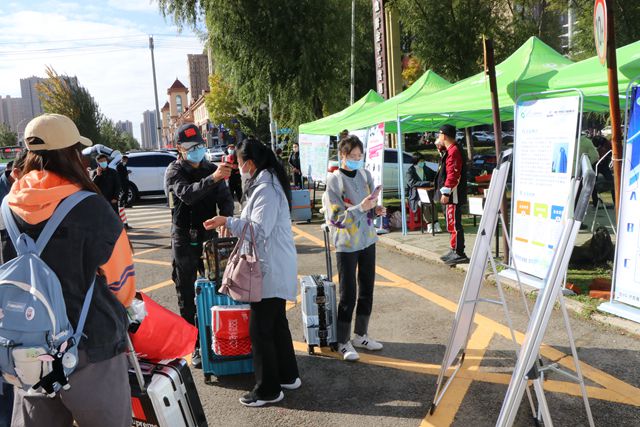 在校园南门,新生经扫描龙江健康码和测温后进入校园报到区。