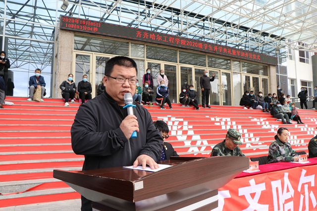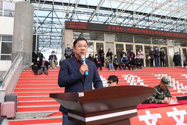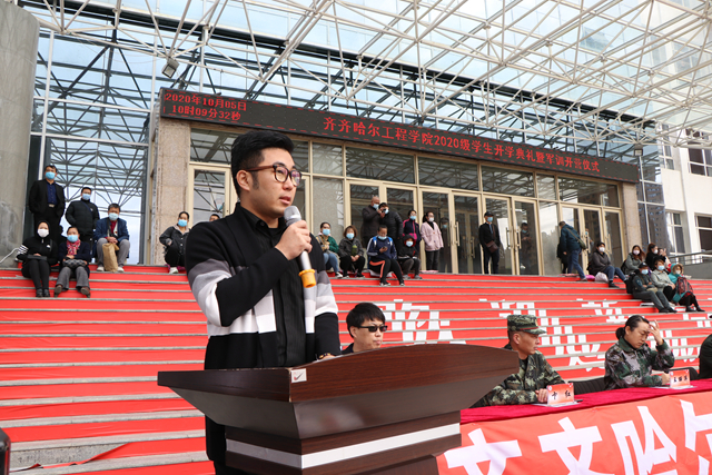 2020级新生代表、计科专业郭魁远同学在发言中,感慨来校报到时学长学姐们的热情相迎、北国校园渐浓秋色、见到辅导员老师和同学们的融洽氛围。表示要在接下来的新生军训中, 做到尊重教官、服从命令、刻苦训练,积极参加军训期间学校为新生组织的入学导航教育系列活动,在今后的学习和生活中做到,严格遵守学校各项规章制度,勤奋学习,积极参加社团活动,努力把自己培养成为“志存高远、人格健全、基础扎实、特长明显的应用性、职业型的创业者”。