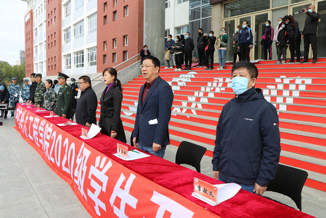 学校创校校长、理事长曹勇安,党委书记李敏义,副院长蒋春艳,工会主席、总会计师姜岩,副院长张振笋,与齐齐哈尔市龙沙区武装部政委尚晓伟,齐齐哈尔市空军93320部队管理参谋李强,学校团委负责人、军训团政委郭明敬,建筑工程系、健康与护理系学生工作副主任王丽萍,信息工程系学生工作副主任孙晓芳,机电工程系学生工作副主任王虹,学生社区服务中心负责人、军训团参谋长卞红,与来自全国17个省份的1820余名2020级学生及部分家长共同参加仪式。