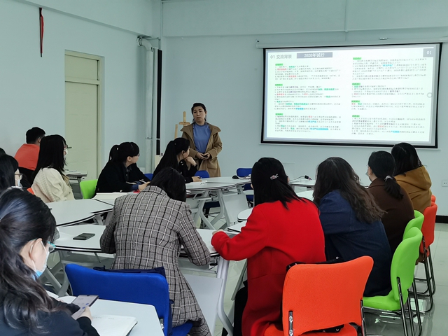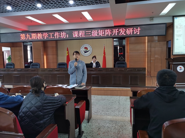活动中,特邀教务处处长王丹就“课程三级矩阵开发”对来自各系(部、中心)的全体教师做学习交流分享,教师发展中心主任孟艳辉主持活动。