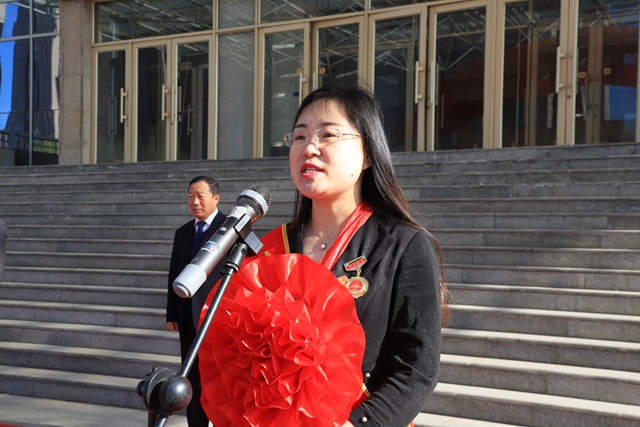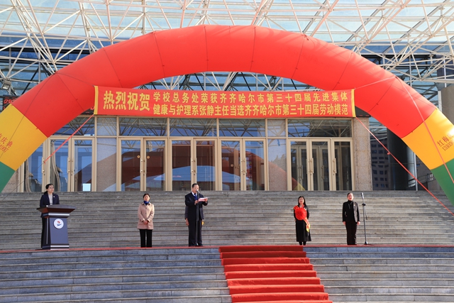 市劳模张静做表态发言:感谢学校推荐自己为齐齐哈尔市第三十四届劳动模范,感谢学校多年来对自己工作的认可与支持。自己从一名普通教工到市级劳模,18年来,伴随学校的发展、壮大而成长、成熟,从经济管理系到管理工程系再到健康与护理系,从北校区到南校区再到海南三亚,从职业学院到工程学院一路走来,从一名普通教师成长为一名系主任,从一名助教晋升为教授,回顾以往,能为学校的发展壮大,尽自己的一份微薄之力,感到无比的骄傲和欣慰。荣誉归于大家,未来在于创造,本科教学评估已经顺利通过,让我们携起手来,为学校的发展壮大献计献策,为开创学校的美好明天而努力工作。