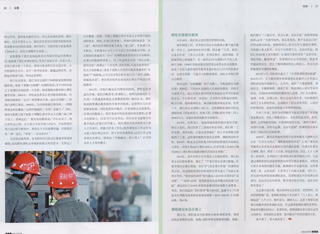 2011年,学校升格为应用型本科院校,课程也亟须迭代升级。我们不断思考:在课程上,本科与高职有什么区别?与普通本科比较又有哪些异同?我们认为,课程体系既要满足教育部的专业学历标准,还要符合人社部的职业标准,同时也要结合地方、行业及特定企业需求;在课点的数量上,则应考虑学科的系统性和完整性;在课点的质量上,以学习产出为导向,用学生学习效果评价教学成效;在课点的序量上,校内课堂以知识体系为主嵌入工作项目,即教学任务工作化;校外课堂以工作过程为主嵌入相应理论知识,即工作任务课程化;运用工作过程系统化的理论,探索出“产教融合,双元育人”应用型本科人才培养模式。
