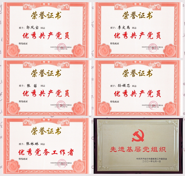 招生办郭凤宝、健康与护理系张苗、教师发展中心李文禹、继续教育部孙娱芯被市委教育工委授予“优秀共产党员”称号,建筑工程系王丽萍、健康与护理系张林琳被市委教育工委授予“优秀党务工作者”称号,健康与护理系党总支被市委教育工委授予“先进基层党组织”称号。