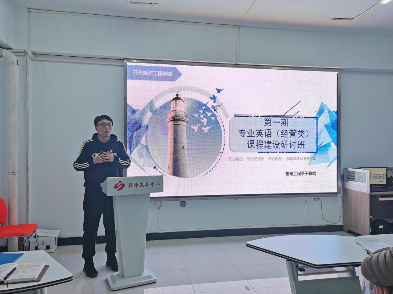 随后,班长于骁晗针对此次研修班的意义、方式、成果产出和研修要求进行阐述。作为管理工程系财务管理专业《专业英语》的授课教师,于老师将在后续的研修过程中,通过说课等方式带领研修班进行经管类《大学英语》教学大纲、开课说明、思政指南等内容研讨与开发。