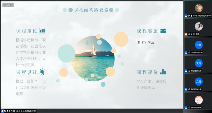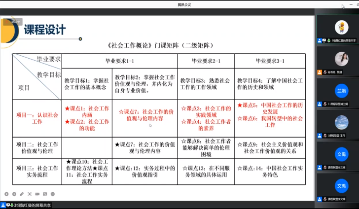 河北大学李旸老师从课程四要素视角分享了《个案工作》的开发,表示本期工作坊时间比较紧凑,研修内容比较丰富,对三级矩阵有了非常深刻的理解,对于其课程开发有很大的指导作用;同时提出了对态度点的考核方式,整体而言有很大的收获。