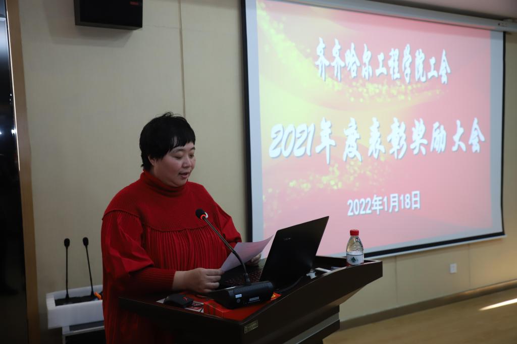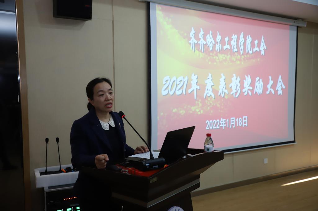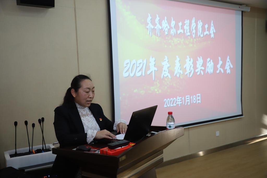 表彰会上,学校工会组织部长张磊宣读了学校工会2021年度表彰奖励决定。工会主席姜岩分别为获得星级工会、支持工会工作特别贡献奖、优秀工会财务工作积极分子和学校2021年度优秀工会干部和优秀工会积极分子颁奖。并代表学校工会委员会,向受到表彰的先进集体和先进个人表示热烈的祝贺,向学校各级工会干部和广大工会会员表示衷心的感谢。