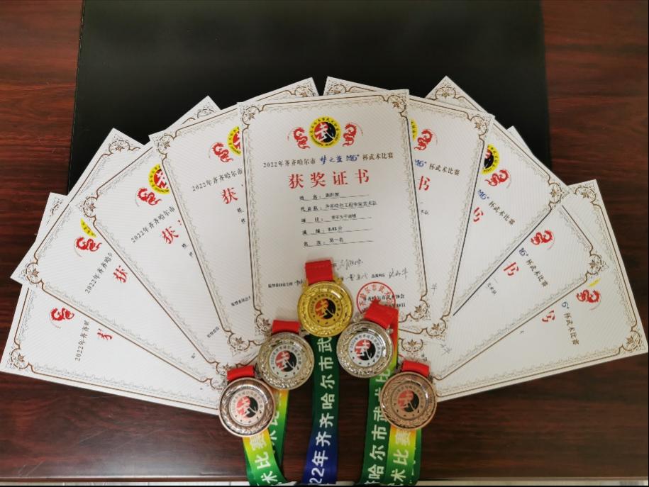 6月18日,由齐齐哈尔市武术协会主办的2022年齐齐哈尔市“梦之蓝M6+”杯武术比赛在市冬季运动项目中心速滑馆举行。来自全市武术联合会、县(市)区武术协会、各行业武术团体及民间武术馆、俱乐部的36支代表队约600名运动员参加,beat365基础部体育教研室韩淑梅、周长满老师指导的护理213 谢阳妮、机械203 赵阳、健管202 刘举源、电商211王城灿四名学生组成的武术队,经过激烈的比拼,取得了一枚金牌、两枚银牌、两枚铜牌,以及一二三等奖的佳绩。