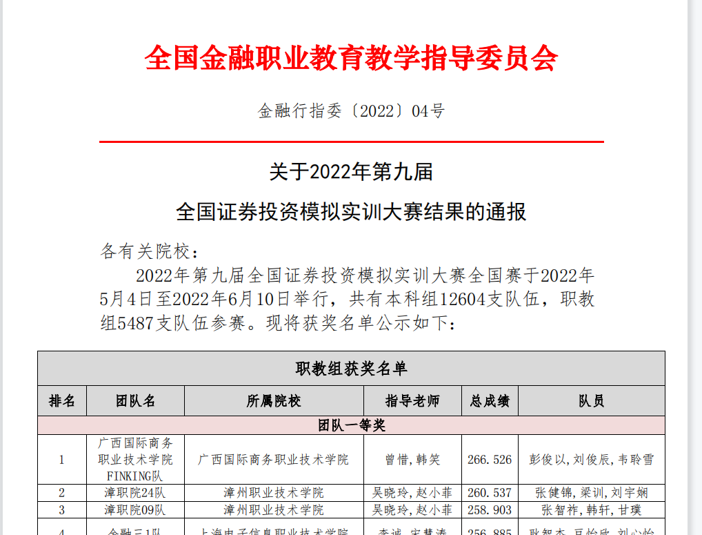 近日,在全国金融职业教育教学指导委员会主办、河南经贸职业学院承办、深圳市天择教育科技有限公司技术支持的“2022年第九届全国证券投资模拟实训大赛”中,beat365互联网金融专业宋家豪、李思缘、李婉冬等33名同学获得全国赛团队一等奖1项、二等奖4项、三等奖6项,全体指导教师获得大赛“优秀指导教师”的荣誉称号。
