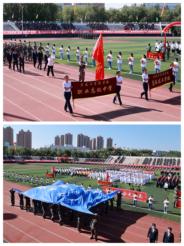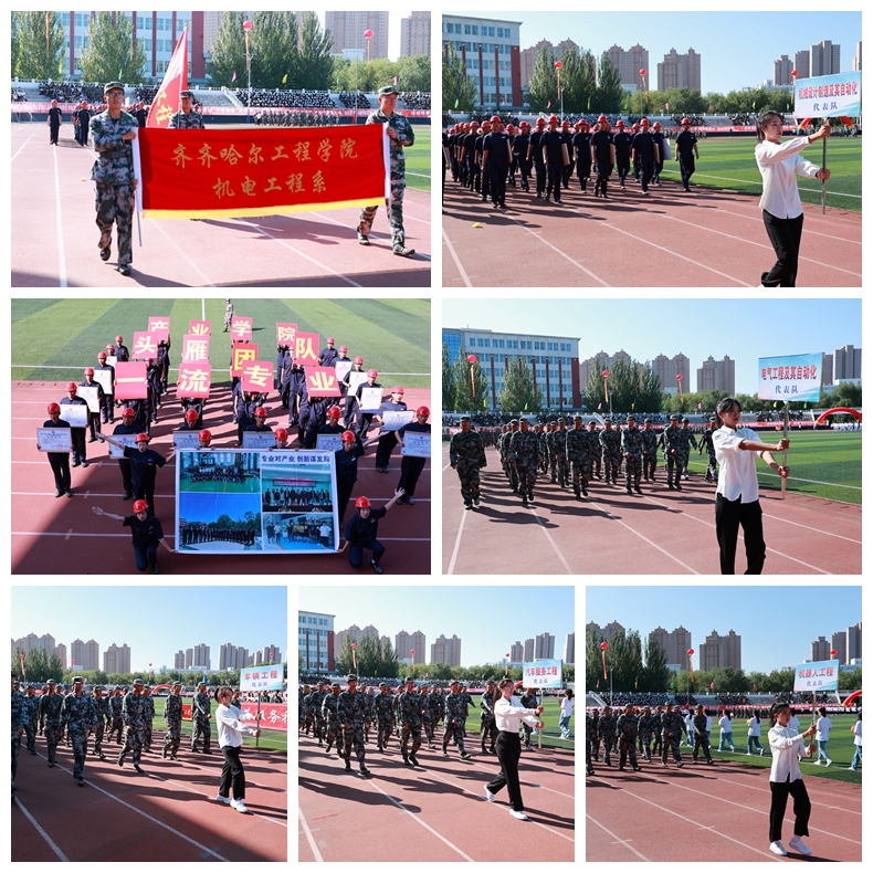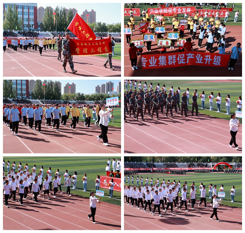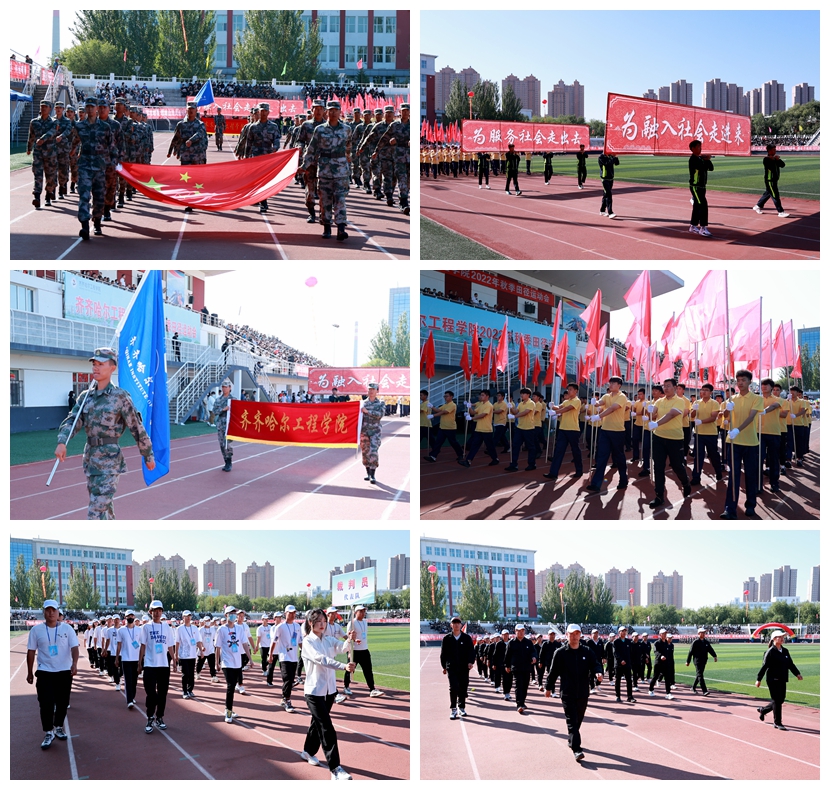 伴随着雄壮激昂的《运动员进行曲》,由国旗方队、教官方队、校旗方队、标语牌方队、红旗方队、花束方队、彩球方队、裁判员方队、教工方队、各系方队组成的37个代表队迈着整齐的步伐,迎着初升的朝阳,带着灿烂的笑容依次通过主席台,接受检阅。他们英姿飒爽、口号嘹亮,展现了团结奋进、昂扬向上的精神风貌,表达了全体师生对体育运动的热爱之情和对党的二十大胜利召开的美好祝愿。