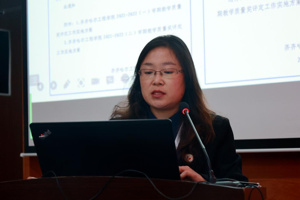 教务处处长张静作了2021-2022学年度第二、三学期教学质量奖评选工作情况汇报。依据审核评估要求,完善质量评定标准和原则,围绕四个导向具体介绍评定结果,指出本次评定新增专业教学管理团队奖项,评定从课程开发向课程管理倾斜,强调做好课程思政是下一步评定导向。