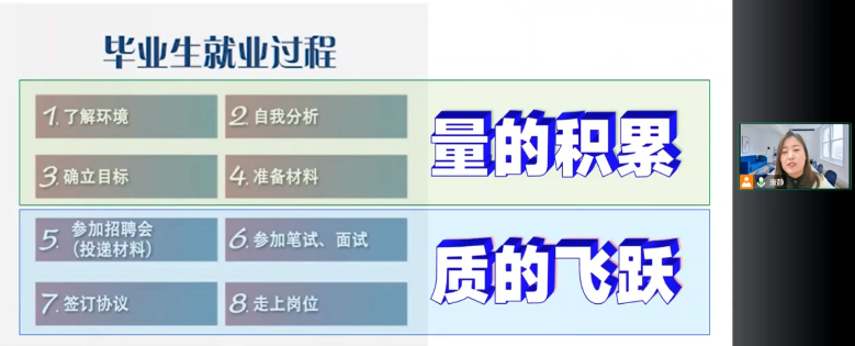 学生发展中心负责人康静从大学生就业形势、就业政策、就业流程三方面说明了2023届毕业生情况,为家长介绍了国家出台的系列支持毕业生就业政策,推荐就业服务平台,并就家长参与学生就业工作提出建议。
