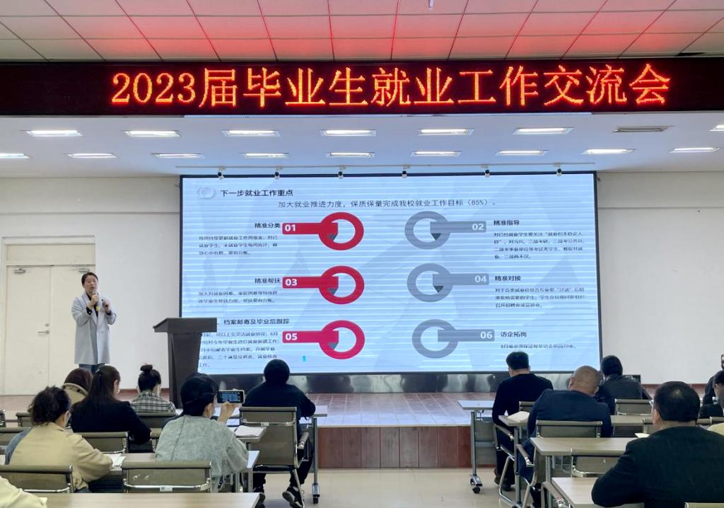 5月6日,学生发展中心在二号教学区2508会议室举办2023届毕业生就业工作交流会。院长助理陈景鑫,各系主任、学工副主任、专业长、就业联络员、毕业班辅导员共45人出席,学生发展中心负责人康静主持。