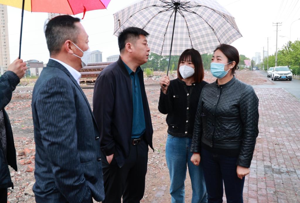 校领导同测绘与施工方负责人现场交流,希望齐心协力,共同打造高质量地标性建筑。