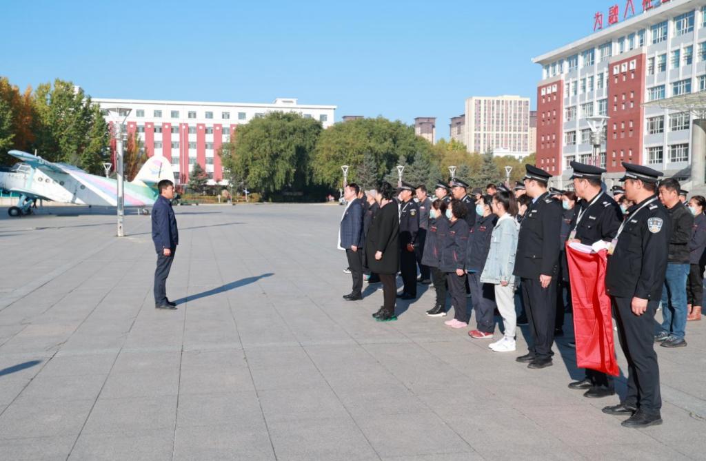 2023年10月11日早上8时,学校后勤服务总公司在明德广场举行宣誓仪式,后勤服务总公司副总经理、基建办主任崔晓东,总务处副处长宋兴蕾,科技园负责人、保卫处副处长成超以及全体后勤人员参加。