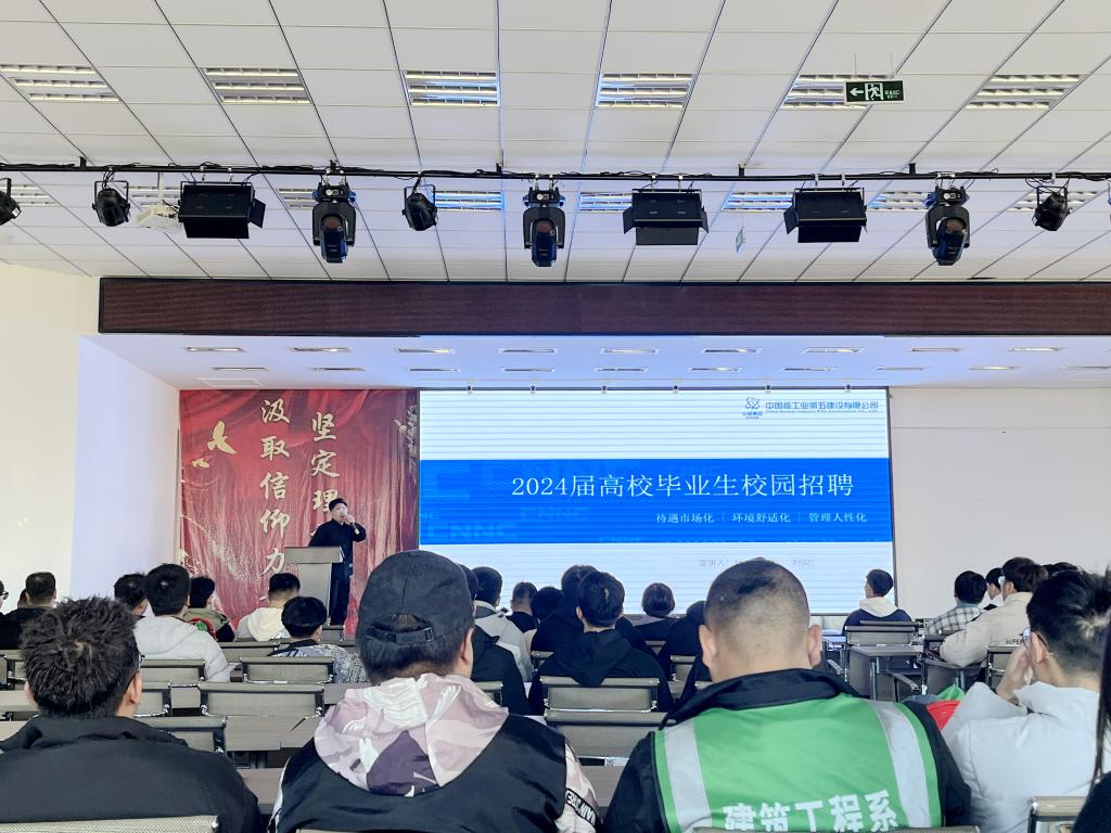 中国核工业第五建设有限公司隶属于中国核工业集团有限公司。宣讲会上,企业与学生进行交流互动,现场气氛热烈。学生深入了解了企业的规模及发展方向以及入职条件,对该公司产生了浓厚兴趣,纷纷表达求职意愿。该公司是第一次来到学校进行就业宣讲,对学校应届毕业生给予了很高的评价,认为学校学生专业过硬,基本功扎实,沟通能力强。