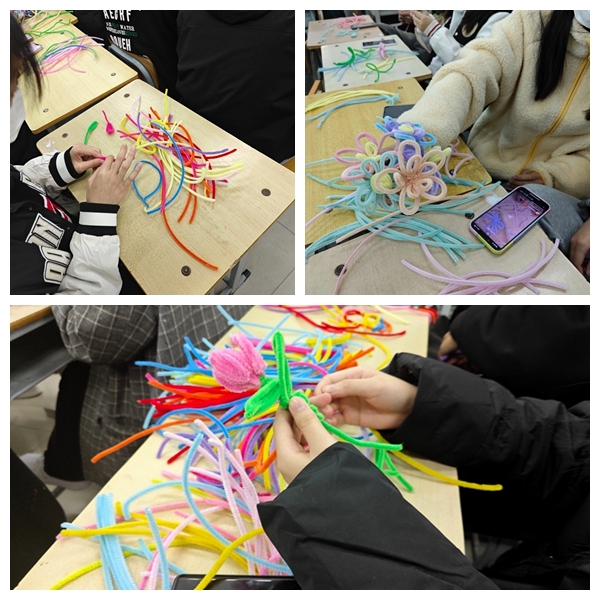 活动开始,社团的工作人员准备了和各色的扭扭棒。学生手中拿着扭扭棒,发挥自己的想象力,将扭扭棒用心编织成各种小物件。