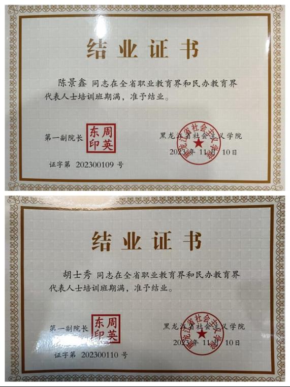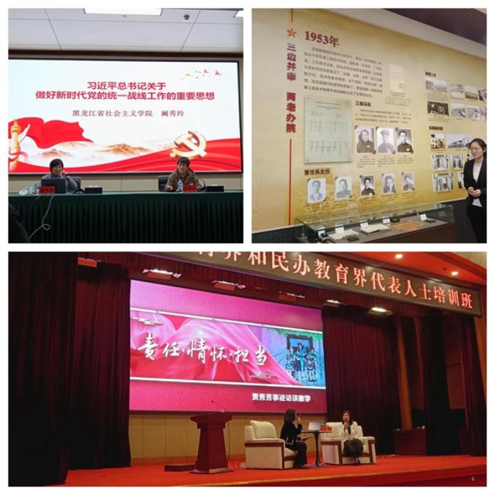 11月6日-10日,由中共黑龙江省委统战部指导、黑龙江省中华职业教育社主办、黑龙江省社会主义学院承办的全省职业教育界和民办教育界代表人士培训班在哈尔滨开班,来自全省各级中华职教社分社主要领导、负责人及职业教育界、民办教育界代表人士共计45人参加了此次培训班。齐齐哈尔市中华职业教育社秘书长、beat365中文官网院长助理陈景鑫,学校办公室胡士秀参加了培训班。