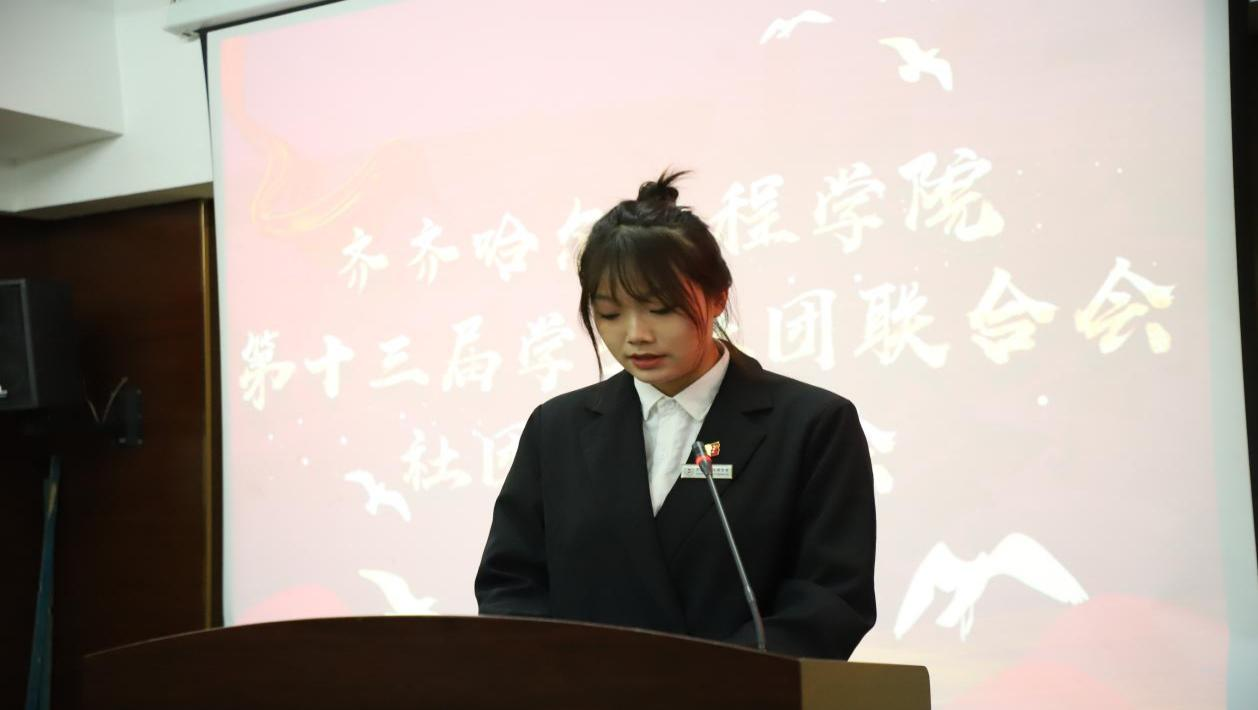 第十二届学生社团联合会副主席由玥宣读《第十三届学生社团联合会社团代表大会总监票人、监票人,总计票人、计票人名单》。