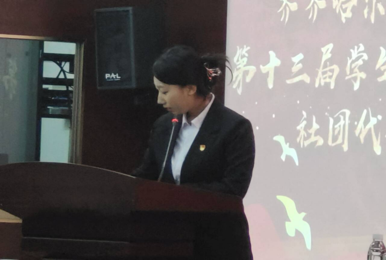 王雪老师致会议开幕词,并对过去一年中第十二届学生社团联合会干部的工作表示充分肯定,同时对第十三届学生社团联合会干部寄予厚望。