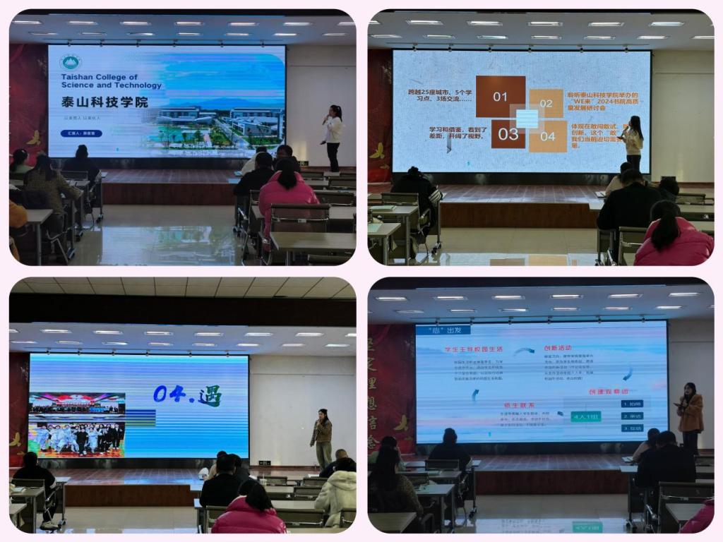 张云惠老师从泰山科技学院的校园活动入手,从育人空间建设、成果物化及学生活动体系建设三个方面重点阐述考察过程中的所见、所闻、所感;团委王雪老师介绍了泰山科技学院“完满教育”育人体系,并与beat365社团建设、青年志愿者服务建设进行对比,结合beat365特色及审核评估要求制定出新学期团委活动计划;健康与护理系辅导员李安琪着重强调环境育人的重要性,提出在新学期工作中要进一步发挥环境育人的优势,以学生的兴趣和需求为主体开展系列工作;管理工程系辅导员刘天缘结合此次考察学习提出下一阶段工作思路:以“心态度”服务学生、以“心深度”激发活力、以“心观察”走近学生,并制定了新学期“一系一特色”专属系列活动方案;建筑工程系辅导员宋雪微表示在新学期开展各项工作时,要始终思考新情况、新问题,要结合学情制定活动方案,利用校外资源,整合校内资源,努力形成品牌;信息工程系辅导员薛苗苗以“美育”为抓手进行分享,表示通过此次考察学习体会到了“书院制”育人的成效与创意,在新学期将围绕“美育”开展系列特色活动,为学生提供更多美育机会;学生工作处高景阳老师对泰山科技学院营地教育中心、师资力量、素质拓展训练课程等方面进行介绍,并对下一阶段工作计划有了详细部署。