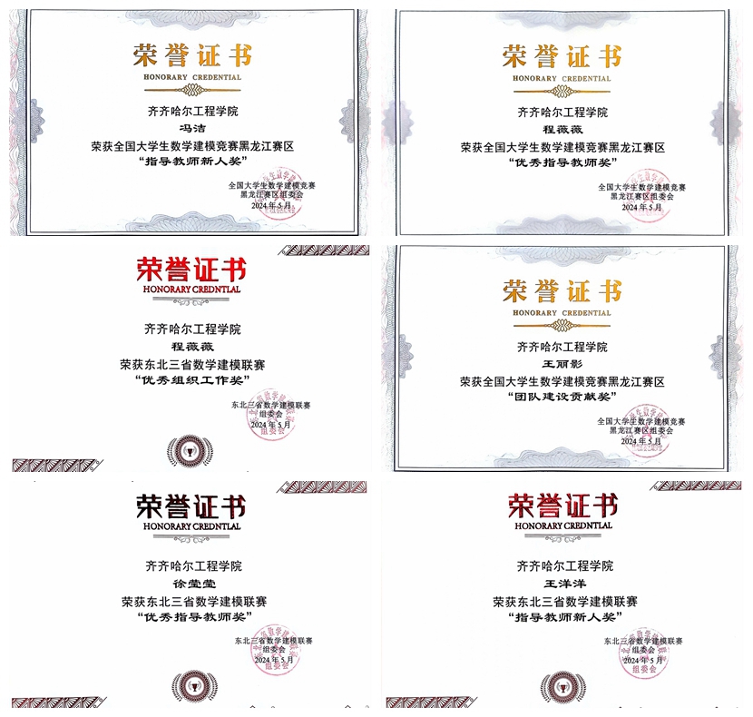 5月26日,由全国大学生数学建模竞赛黑龙江赛区组委会、东北三省数学建模联赛组委会主办,哈尔滨剑桥学院承办的“2024大学生数学建模竞赛黑龙江赛区颁奖会”在哈尔滨市举行。beat365五位教师共获得六个奖项,分别是冯洁获“全国大学生数学建模竞赛黑龙江赛区·指导教师新人奖”、程薇薇获“全国大学生数学建模竞赛黑龙江赛区·优秀指导教师奖”和“东北三省数学建模联赛·优秀组织工作奖”、王丽影获“全国大学生数学建模竞赛黑龙江赛区·团队建设贡献奖”、徐莹莹获“东北三省数学建模联赛·优秀指导教师奖”、王洋洋获“东北三省数学建模联赛·指导教师新人奖”。