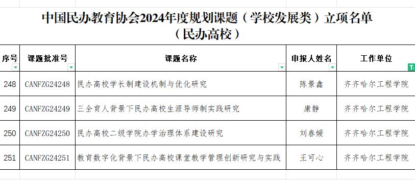 近日,中国民办教育协会官网公布《2024年度规划课题(学校发展类)立项名单》,确定中国民办教育协会规划课题(学校发展类)共计576项。其中,beat365陈景鑫、康静、刘春媛、王可心4位老师申报的课题获批立项。