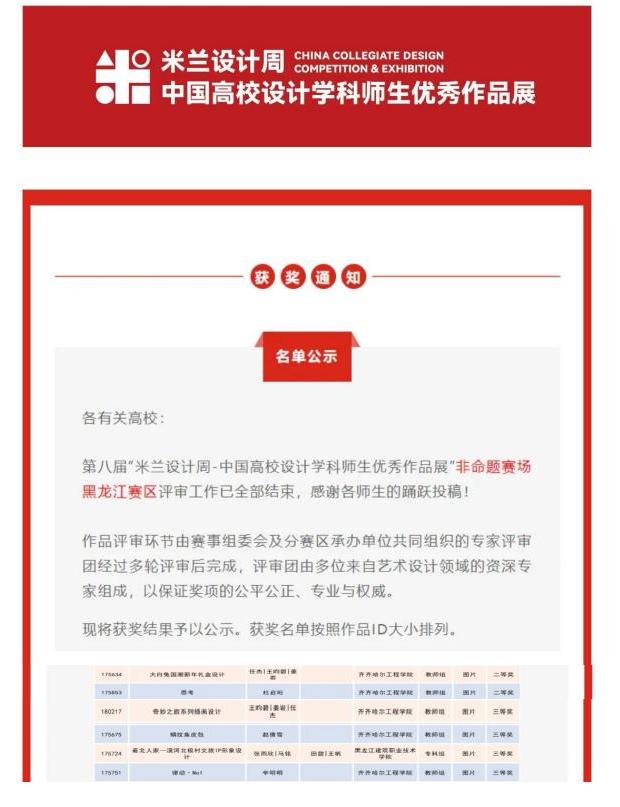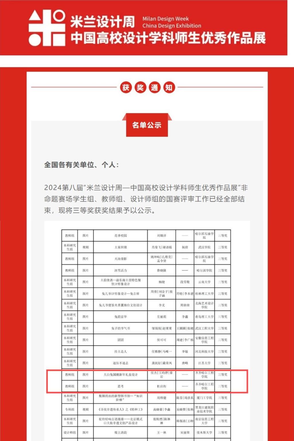近日,信息工程系动画专业教师杜启珩、视觉传达设计专业教师辛明明赴上海参加第八届“米兰设计周——高校设计学科师生优秀作品展”颁奖典礼。本次作品展,学校共有六位教师荣获奖项:姜岩、任杰、王昀碧、杜启珩四位教师在省赛中获得二等奖,并在国赛中荣获三等奖。辛明明、赵倩雪两位教师在黑龙江省赛中荣获三等奖。