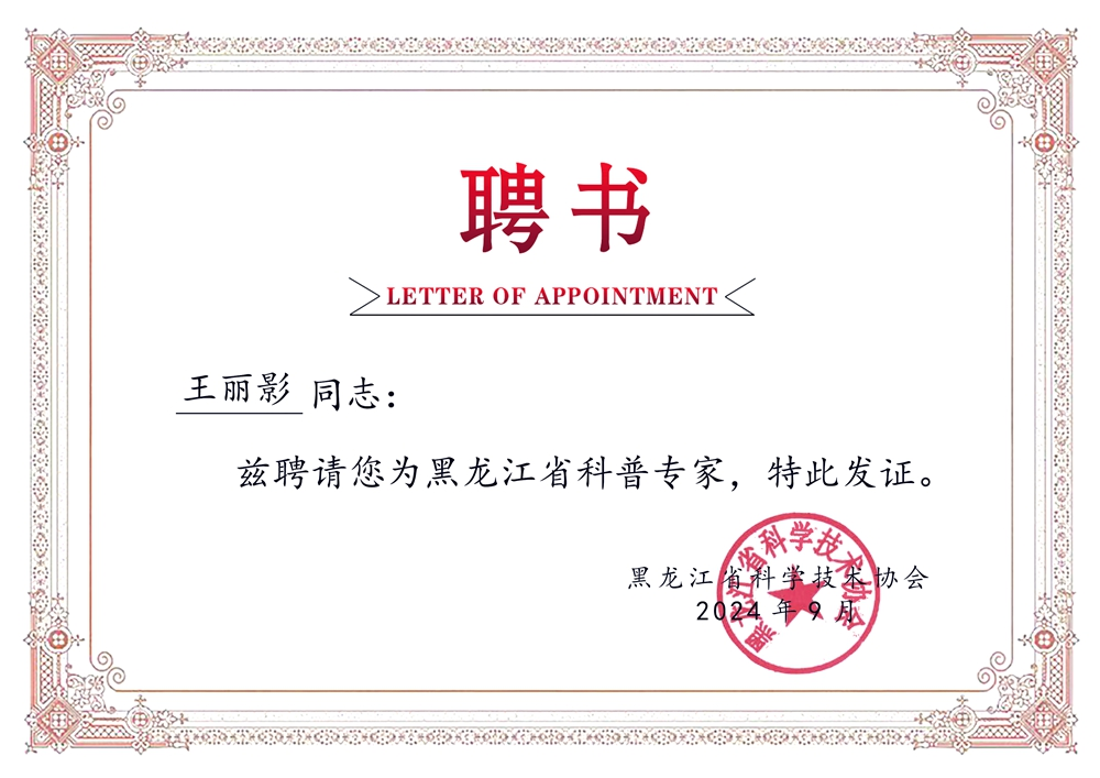 经学校推荐、省科协审核,beat365信息工程系李野、高敏,基础部王丽影、于洪杰4名教师被聘为黑龙江省科普专家。